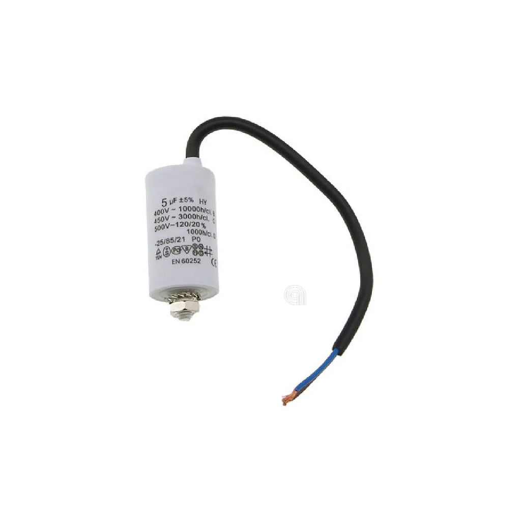 Arbeitskondensator **MONDO** und **UNIVERSALE** vom anpassbaren Typ, unerlässlich für den korrekten Start und Betrieb des Motors Ihrer Waschmaschine. Mit einer Kapazität von **10 Mikrofarad (µF)** und ausgelegt für den Betrieb bei 450V Wechselspannung, gewährleistet dieses Bauteil eine optimale Leistung und eine lange Lebensdauer. Es handelt sich um einen hochwertigen Universalersatz, der zahlreiche Originalreferenzen ersetzt und sich ideal für die Wartung einer breiten Palette von Haushaltsgeräten eignet. Das Design beinhaltet ein Kabel zur erleichterten Installation. Legen Sie stets Wert auf Sicherheit und prüfen Sie die Kompatibilität der Kapazität (µF) mit dem Originalkondensator Ihres Geräts.