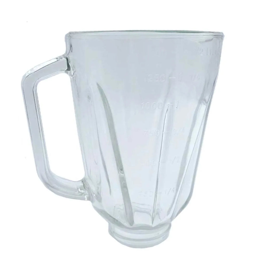 Nicht gehärteter Glasbehälter für einen amerikanischen Standmixer. Vermeiden Sie plötzliche Temperaturschwankungen mit heißen und kalten Flüssigkeiten, um Brüche zu vermeiden.