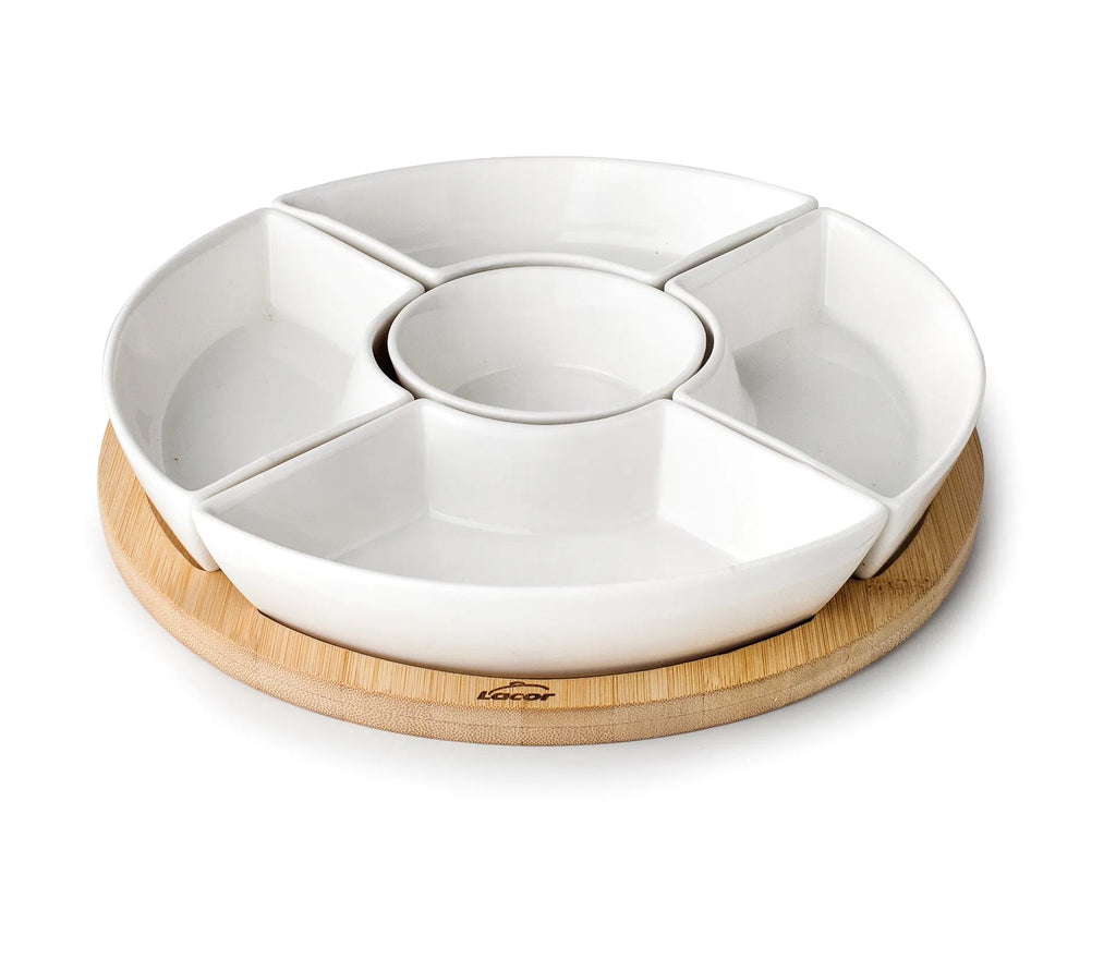 Bandeja de bambú con 5 cuencos de porcelana para servir pequeñas porciones.