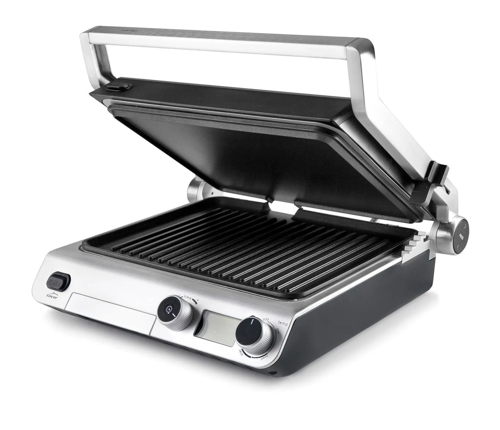 Doble zona de cocción: 1) Grill (27x22 cm): ideal para asar carnes, pescados, marisco, hamburguesas o verduras. 2) Lisa (27x22 cm): ideal para preparar tortitas, huevos, tostadas o verduras.