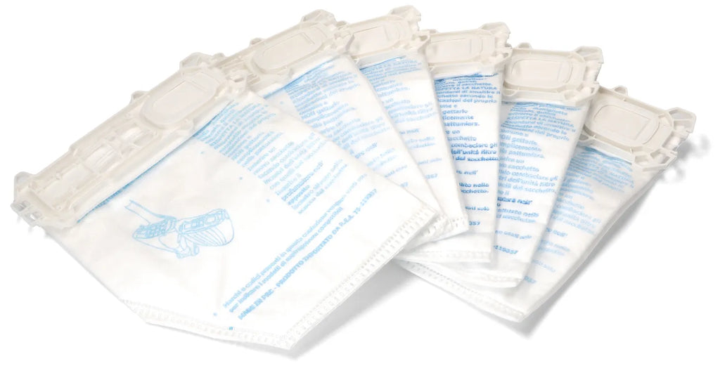 Verpackung von 6 Stück synthetischen Staubsaugerbeuteln Diese hochfiltrierende Einheit sammelt den gesamten Staub auf und verhindert, dass er zurück in den Raum gelangt.