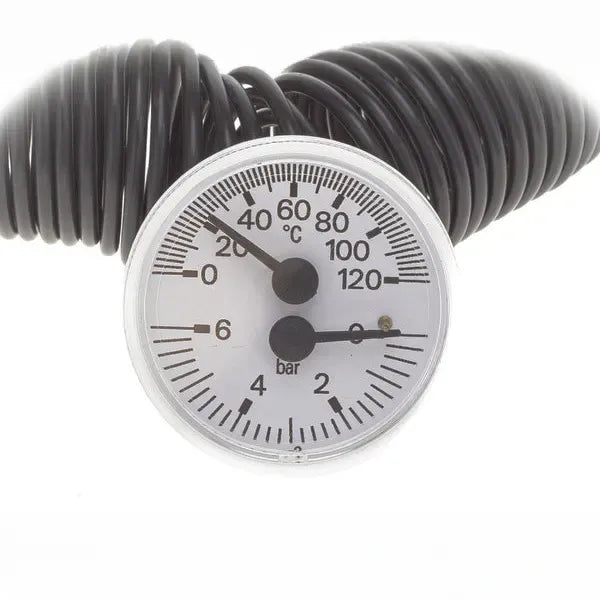 Das Thermohydrometer ist ein kombiniertes Messinstrument, das die Temperatur und den Wasserdruck in Ferroli-Kesseln misst und eine präzise Kontrolle des Heizsystems ermöglicht. Dieses Modell GNK 100 M Einheit ist dafür ausgelegt, Temperaturen zwischen 0 und 120 ºC sowie Drücke von 0 bis 6 bar anzuzeigen, wodurch mögliche Fehler oder anomale Zustände im Kessel erkannt werden können.
